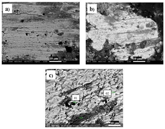 SEM micrographs of the steel fibres present on the surfaces of the pins that worked as primary plateaus: (a) M0, (b) M0_G and (c) M0_CN. The numbers 01 and 02 show the positions of the local EDX analysis (Table 6).
