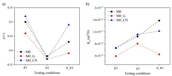Comparison of (a) µ values and (b) Ka values obtained during the tests at RT, HT and H_RT.