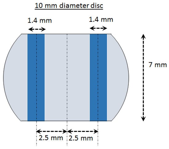 A PSC tool was designed considering these geometric relations and the dimensions of samples produced by HPT processing. The typical dimensions of HPT discs are diameter of ~8 mm or ~10 mm and thicknesses of ~0.7~0.8 mm. An example of the geometry of samples produced by HPT is provided in the following section. Thus, a tool was designed and machined with a breadth of 1.4 mm which allowed the testing of samples with thickness of 0.7 mm or lower and width of 7 mm or larger. An illustration of the tool design and a photo of the PSC apparatus are shown in Figure 1b,c respectively.
