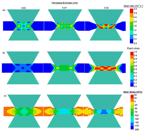 Figure 4 shows the distribution of (a) strain-rate, (b) plastic strain, and (c) mean stress at different stages of plane strain compression considering 2D condition. The distribution of strain-rate describes the shape of the deformation zone and it is seen that it is not homogeneous and varies depending on the thickness of the workpiece. Thus, for a thickness of ~0.63 mm the deformation zone displays a double “X” shape and it changes to a triple “X” shape at a thickness of ~0.47 mm and to a “W” shape at ~0.32 mm. This change in the shape of the deformation zone is related to the ratio between the tool breadth and the workpiece thickness. It is worth noting that strain localization in shear bands have been reported in a 5182 aluminum alloy subjected to PSC and the shape of the shear bands varied depending on the sample thickness [17].