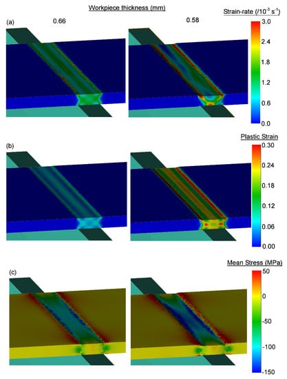 The heterogeneity of the deformation zone affects the accumulated distribution of plastic strain which is also heterogeneous. For instance, at a thickness of ~0.32 mm the effective strain calculated from Equation (3) is ~0.90 but values in the range 0.7~1.0 are observed. The distribution of mean stresses reveal that the deformation zone is located under compressive (negative) mean stresses at all stages of deformation. Tensile stresses develop outside the deformation zone.