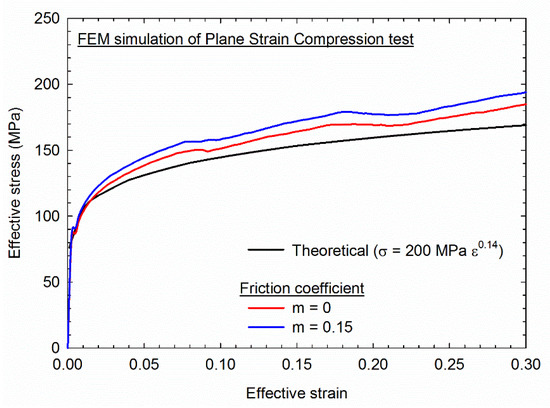 In order to estimate the accuracy of the plane strain compression test to determine the stress–strain behavior of the material, the load and displacement data from the 3D simulations were converted to effective stress and effective strain considering the relationships in Equations (2) and (3). Figure 6 shows the simulated stress–strain curves for simulations considering frictionless conditions and the simulation considering a friction coefficient of 0.15. The theoretical curve, used as input in the simulations, is also shown for comparison. The simulated curves display a minor fluctuation which is attributed to the oscillations in the deformation zone. In fact, experiments revealed some fluctuations in the response of the PSC test, which tend to overestimate the flow stress depending on the b/t ratio [11]. This agrees with the slight overestimation of the flow stress in the stress–strain curves from the simulations. Another source of deviation in the stress–strain curve is the heterogeneity of distribution of plastic deformation which tends to concentrate deformation and therefore promotes a faster local strain-hardening. This effect is only expected in materials which display strain-hardening behavior. Therefore, it is anticipated that the accuracy of the test is better in samples processed by severe plastic deformation which usually does not display hardening.