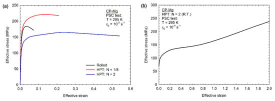 Stress vs. strain curves for pure magnesium determined in PSC tests at initial strain rates of (a) 10−3 s−1 and (b) 10−4 s−1.