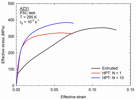Plane strain compression tests were also carried out in the magnesium alloy AZ31. Figure 8 shows the stress–strain curves for samples in the extruded condition and after HPT processing to 1 and 10 turns. The largest number of turns was chosen based on a previous study which showed this processing condition leads to an ultrafine grain structure with average grain size of ~130 nm [23]. The extruded material displays a low yield stress of ~75 MPa followed by a pronounced strain hardening up to a peak stress of ~360 MPa at ~0.12 strain. The level of yield stress, peak stress, and the shape of the curve agrees fairly well with conventional compression of extruded AZ31 alloy with a coarse-grained structure [24]. The material processed by HPT displays significantly higher yield stress and reduced ductility. The peak stress in the material processed by 10 turns of HPT was ~385 MPa. This peak stress agrees fairly well with the range of hardness (105–125 kgf/mm2) reported in the literature [23,25,26,27] for this alloy after HPT processing considering that the flow stress is approximately 1/3 of the hardness [28]. Crack propagation was observed in all samples after the peak stress.