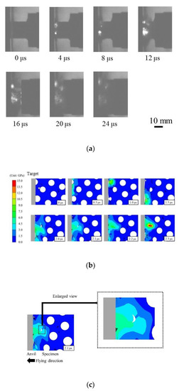 Figure 1a shows a magnified view of the compression process of the UniPore copper structure. After the sample impacted the anvil, the circular pores first deformed into an arc shape, followed by pore volume decrease, and finally, pore collapse. High pressure was generated when the pore surfaces collided. The highest pressure estimated by computational simulations was approximately 25 GPa, where the red region in Figure 1b was at 2.3 µs. The arc shape of the collapsed pores was also confirmed by observing the cross-sections of the impacted samples [20].