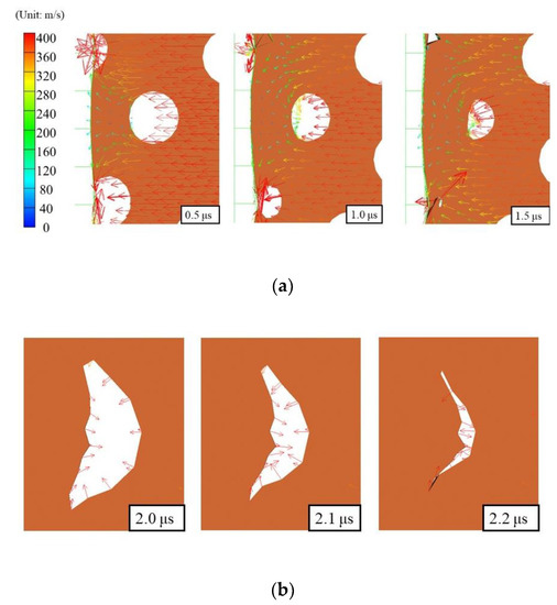 In this section, the mechanism of high-pressure generation around the pores is investigated by computational simulation. Figure 2 shows the position of the pressure gauges positioned around the selected circular pore, at the front of the sample computational model. Gauges 1 and 3 are located on the pore’s front and back surfaces, respectively, on the pore’s horizontal axis, considering the impact anvil. Gauges 2 and 4 are located above and below the pore, respectively, converging at the arc shape, as shown in Figure 1. Figure 3a shows the velocity vectors at 0.5, 1.0 and 1.5 µs, and Figure 3b shows the velocity vectors at 2.0, 2.1 and 2.2 µs. In Figure 3a, the velocity vectors of the material around the pore on the anvil side are reversed. Figure 3b shows that the velocity vector is towards the centre of the pore. The reason for this gauge arrangement is that the velocities with the x-axis of gauges 1 and 3, and the y-axis of gauges 2 and 4, contribute to the generated pressure at the time of impact.