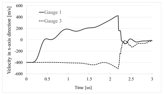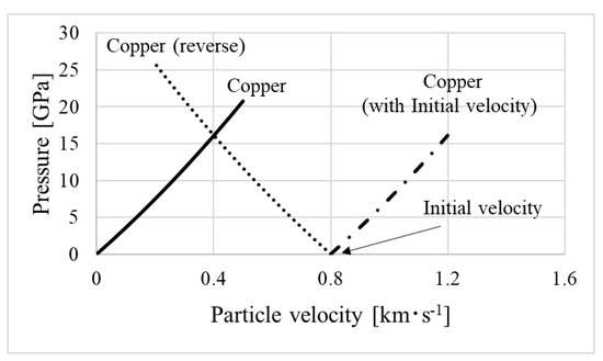 The positive longitudinal direction (right) of the computational model and the flying direction of the sample (left) were opposite. According to Figure 4, the velocity of the pore’s front surface (gauge 1) reduced fast to zero when the specimen collided with the anvil, and then increased in the reverse direction to finally surpass 400 m/s, just before colliding with the opposite surface at the back of the pore. The velocity of the pore’s back surface (gauge 3) remained at approximately −400 m/s until the pore surface collision and inevitable collapse. The combined impact velocity of the pore surface at collapse was estimated at 800 m/s. The pressure peak generated during the copper pore surface collisions can be calculated using an impedance matching technique that uses the Rankine–Hugoniot equation relating pressure to particle velocity [25]. Figure 5 shows the impedance matching relationship for a copper-to-copper collision with an initial velocity of 800 m/s, leading to a pressure intersection of about 16 GPa. The pressure intersection in Figure 5, that is, the potentially generated pressure value, is calculated as 16 GPa. Since the pressure estimated by the velocity in the x-axis alone does not reach the 25 GPa estimated by the computational analysis [20], the next step is to investigate the transversal direction.