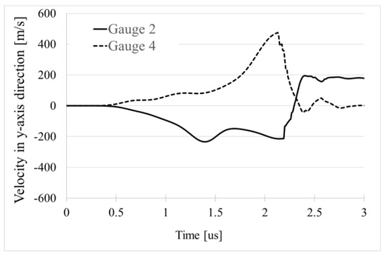 The velocities of the pore surface at gauges 2 and 4 in the transversal direction were observed next (Figure 6). The positive transversal direction of the computational model in Figure 2 is oriented upwards. The top of the pore (gauge 2) shows a gradual transversal velocity increase towards the pore centre (downward movement) due to arc-shape deformation, reaching approximately −200 m/s at total pore collapse. The bottom of the pore (gauge 4) also moves towards the pore centre with a positive increasing transversal velocity following the same deformation mechanism, reaching approximately 480 m/s at pore collapse. The velocity difference is due to varying local structure stiffness around the observed pore as a consequence of the different positioning of the neighboring pores. Assuming collision only in the y-axis direction, the generated pressure value was calculated by the impedance matching method to be 11.8 GPa.