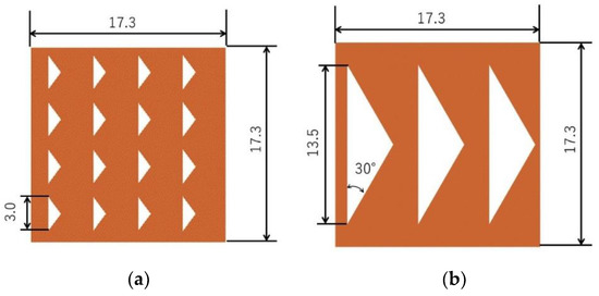The circular pore shape of the sample in Section 2 was changed to a triangular shape, which is estimated to produce a higher pressure due to the convergence of the material at a single point when the pore is completely closed. The shape of the proposed cubic cellular samples are shown in Figure 7. Sample 2 is a model for copper-to-copper collisions, where the metal jet is generated at an angle of 20–30° from the welding window, as studied in explosion welding [26]. Here, metal jets are generated in the compression process and collide to achieve a high pressure.