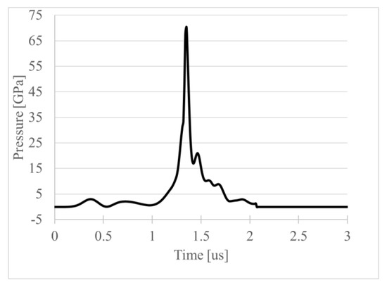 An enlarged view of the compression process of sample 1 is shown in Figure 8, and the pressure history of the most stressed discretisation point around the pore is shown in Figure 9. The material around the pore gathers at one point when the pore is completely closed. Therefore, a large pressure of approximately 70 GPa can be expected by Figure 8 and Figure 9. Although the impedance matching method cannot be applied to this proposed example because it is a triple-point collision, the collision velocity of about 1000 m/s is obtained at point x in Figure 8. Therefore, we can expect to obtain a high pressure as shown in Figure 9.