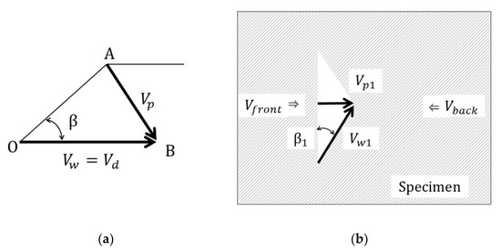 Figure 10a shows the schematic diagram used for explosive welding, where point A moves toward point B with a velocity , and point O moves toward point B with a velocity of , creating a metal jet between edges OA and OB depending on the conditions. The relationship between the velocity and angle is expressed by the following equation, where is the collision angle, and is the welding velocity [26,27].