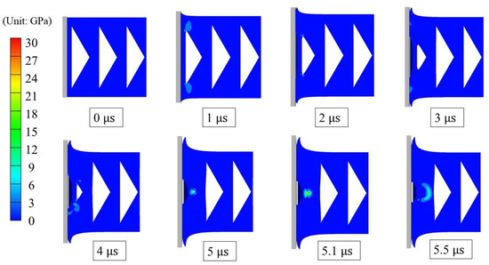 The computationally estimated compression process of the proposed cellular material with triangular pore geometry is illustrated in Figure 11. The pore gradually compressed from both transversal triangle corners towards the apex on the sabot side, and consequently converged to a single point at the time of complete pore collapse. After the first pore collapsed, a pressure wave was generated towards the next pore, indicating that the phenomenon of high-pressure generation continued. Figure 12 shows pressure history near pore estimated by computational simulation and the enlarged view of compression process Figure 11 at 5.1 µs Although this computational simulation can not reproduce the formation of the metal jet, it is expected that even higher pressures will be generated in the experiment due to increased pore collapse followed by the metal jet appearance.