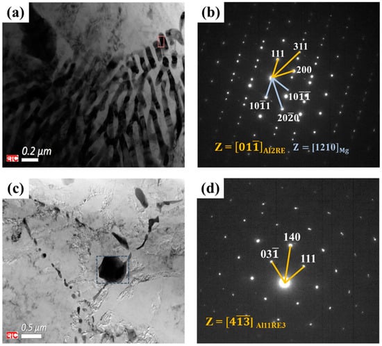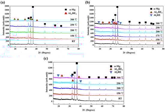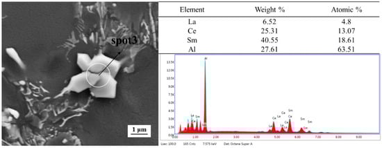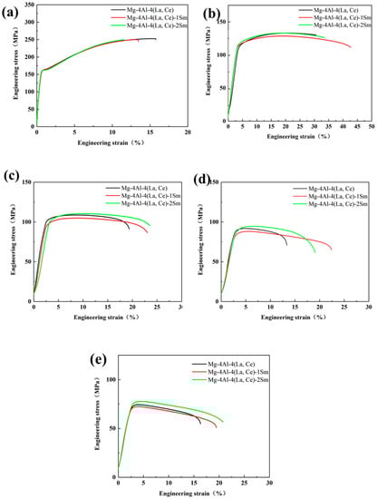 - The addition of samarium to Mg-4Al-4 (La, Ce) alloy reduces the precipitation of Al11RE3 and weakens grain boundary strengthening, but also introduces the second phase of Al2RE. Al2RE can play the role of pinning dislocations and strengthen the α-Mg matrix, especially at high temperatures; it features good high-temperature stability, which is the main reason why the high temperature yield strength of the alloy does not decrease.