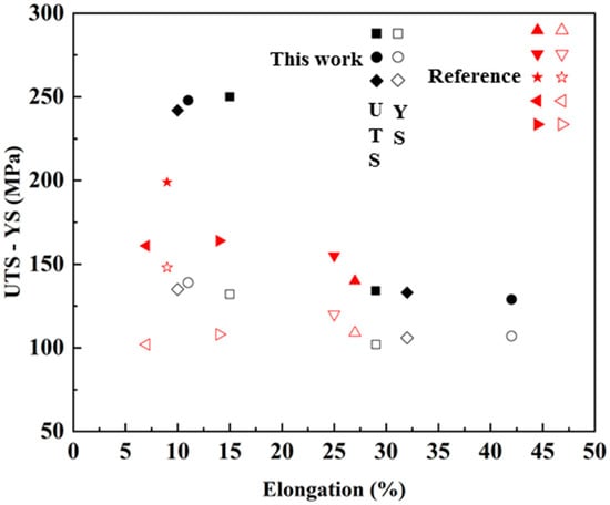 | Alloy | T (°C) | UTS (MPa) | YS (MPa) | ε (%) | Reference |