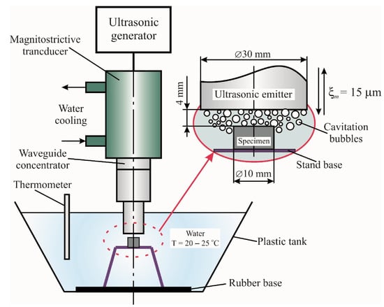 In this way, with the accepted experiment scheme, the specimen surface is located in the zone of intense cavitation, which has high stability and predictability during the processing. To prevent the specimen from moving during ultrasonic treatment, it was glued to a stand, which was installed on a rubber base.
