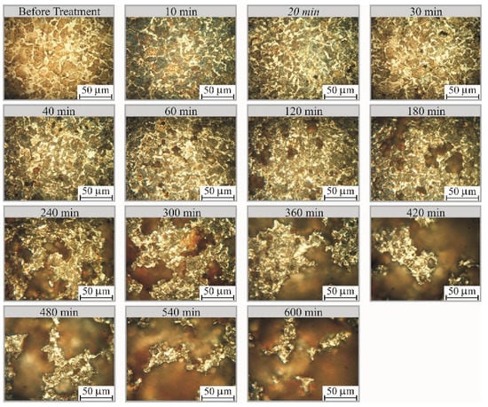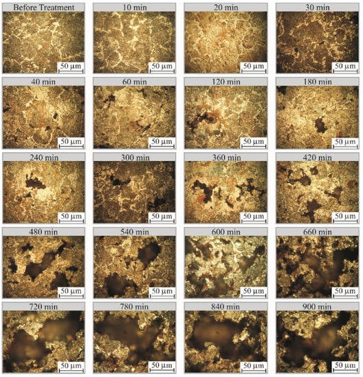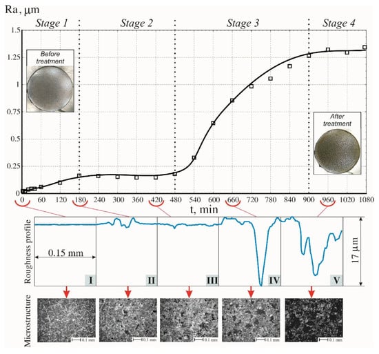 Based on preliminary experiments, the treated specimens were analyzed after 10, 20, 30, 40, and 60 min of treatment and then every 60 min. The treatment finished when the roughness parameter Ra changed by less than 5% over three time intervals in a row.