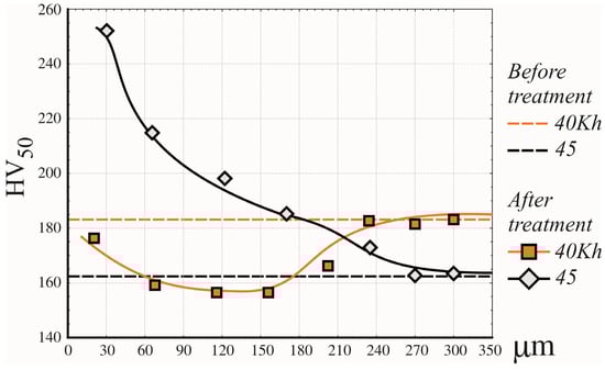 This fact can be explained by the different tendencies of the materials under consideration regarding strain hardening. Figure 4 shows the microhardness distribution profiles from the surface to the depth of the material for specimens treated in the limited state.