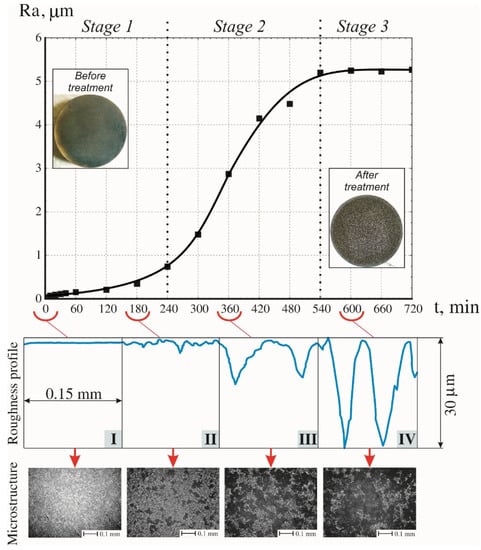 The analysis of the Ra (t) for the 40kH steel relation shows that the changes in roughness occur in 3 stages. In the first stage (0–240 min), there is an insignificant increase in the Ra parameter from 0.04 to 0.74 μm. The second stage (240–540 min) is characterized by an abrupt increase in the rate of roughness growth, whereby Ra increases almost 7 times to 5.2 μm after 300 min of treatment. In the third stage (from 540 min), the roughness does not change.