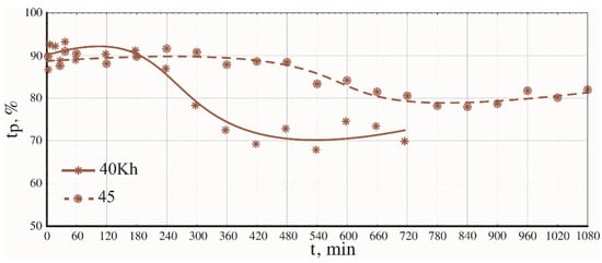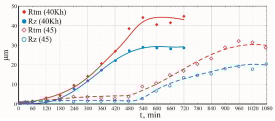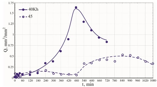 A noticeable extremum can be traced using the function Q (t), which was observed during processing for 480 min for 40Kh steel and for 540–600 min for 45 steel. These times correspond to the moments when erosion does not lead to changes in the roughness parameters. Microdamages and surface deformations occurring at the beginning contribute to the increased oil capacity. Subsequently, when large particles of a material begin to separate from the surface, the actual surface area decreases, which leads to decreased in oil capacity.
