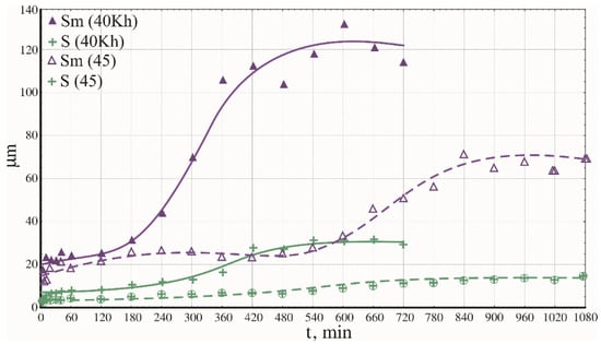 Thus, for the two considered steels of the same class with similar properties, the changes in the microstructure under the action of cavitation treatment differed in nature. Firstly, it can be seen by the presence of the 45 steel (180–480 min) that despite the beginning of the erosional destruction of grains, there was no significant increase in the area of erosional damage.