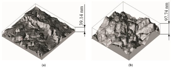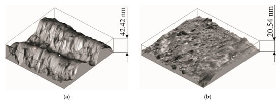 The 3D images of the surfaces were obtained using the constant height method, which involves maintaining the fixed end of the cantilever using the microscope scanner at a constant height [13]. The obtained images measuring 308 × 308 nm are presented in Figure 11 and Figure 12.