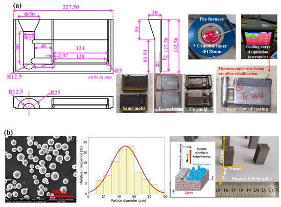 Alloy preparation details. (a) Conventional casting process using crucible electrical furnace and the alloy melt was poured into sand, Fe or Cu mold with the same dimensions (in mm); (b) SEM and particle distribution of Al10SiMg raw powder used for selective laser melting (SLM) and the photo of as-built samples.