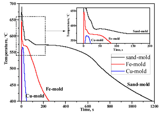 During solidification, the cooling curve (Figure 2) was collected with a temperature acquisition system (YADU700R, Shanghai Yadu Instrument, Shanghai, China) whose acquisition frequency 10 data points per second and accuracy ± 0.1 °C. Before pouring, the K-type thermocouple wire (Ø 0.5 mm) connected with the system was placed at the 10-mm depth of mold shown in Figure 1a. The K-type thermocouple was inserted neither in the pouring gate nor in the bottom part of the mold, which aimed to prevent destroying the casting body. The pre-solidification cooling rate was calculated among the temperature range from 700 °C to 590 °C (liquidus temperature according to reference [19]), which gave the pre-solidification values as 3.5 °C/s under sand-mold condition and 12.5 °C/s under Fe-mold conditions, respectively. However, for the Cu-mold casting, the cooling rate was really difficult to measure because of its fast cooling effect. The pre-solidification cooling rate for Cu-mold was estimated to be ~80 °C/s according to our previous study [20].