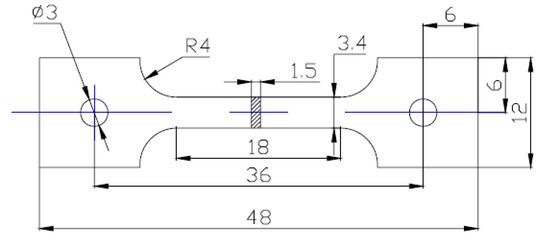 Dimensions of tensile testing sample (in mm, reproduced or adapted from [23], with permission from Elsevier, 2014).