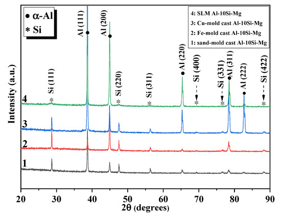 (1) According to the Al-Si binary phase diagram, the solidification process of hypoeutectic Al-Si alloy comprises of two main stages: 1st nucleation and growth of Al dendrites and 2nd nucleation and growth of Al + Si eutectic. When the solidification begins below the liquidus (~600 °C for Al-10Si), the α-Al dendrites nucleate and grow with orthogonal arms. The continuous growth of α-Al phase causes a continuous increase in the Si concentration in the residual liquid. When the Si concentration increases to the critical value “eutectic point 12.6 wt.% Si” (at 577 °C), the liquid phase transforms into the eutectic phase composed of Al + Si [22]. The Si phase grows along the stable close-packed plane {111} [25], making this peak more obvious than other peaks in Figure 4.