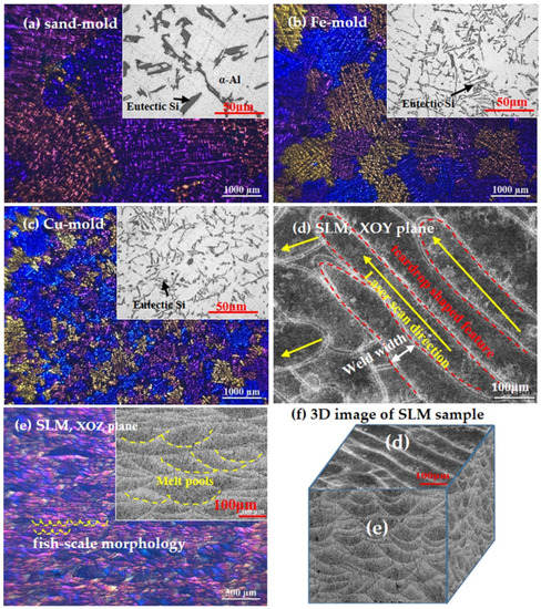 Optical microstructure of Al-10Si-0.5Mg alloys prepared with: (a) sand-mold, (b) Fe-mold, (c) Cu-mold and (d,e) SLM. The image at upper-right corner of (a–c) is the enlarged view; (f) 3D microstructure of SLM alloy constructed with OM images. The color images were observed under the polarized light mode of a microscope to display the grain morphology. Note that the magnification of (d) is different from that of (a–c) to display tiny melt pools (MPs).