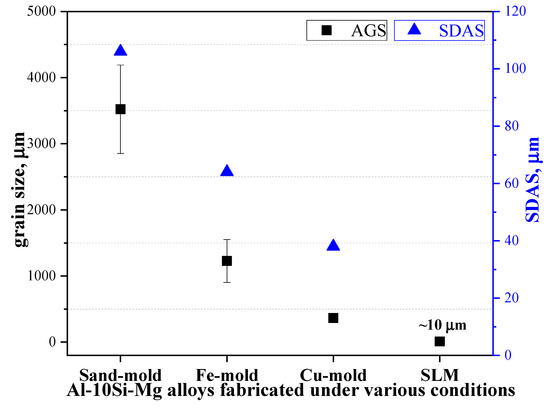 Average grain size of Al-10Si-0.5Mg alloys prepared under different conditions. No SDAS data for SLM alloy due to inapparent dendrites.