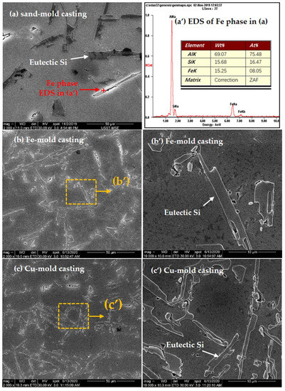 Figure 7 shows the SEM microstructures of conventional cast alloys, where Figure 7b is the typical EDS result of the Fe-rich particles that present in the sand-mold cast alloy. It can be seen that all the three alloys are composed of α-Al and Al + Si eutectic phases, but the morphology of Al + Si eutectic is varied, with an increase in cooling rate. For the sand-mold and Fe-mold castings (Figure 7a–b’), most of the Si particles show blocky shape (or called “flakes”). With an increase in the cooling rate to Cu-mold, the Si particles are obviously refined to be narrower and shorter rods (i.e., needle-like).
