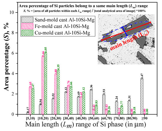 Area percentage (S, %) of Si particles within each main length (Lm) range in the sand/Fe/Cu-mold cast Al-10Si-0.5Mg alloys. Excluding SLM alloy due to the continuous network distribution of Si phase that is difficult to count for each size range.