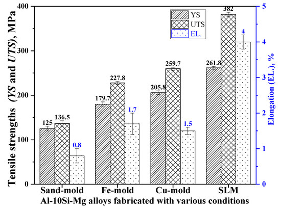 Figure 10 shows the tensile properties of the four alloys. It can be seen that, with increasing the cooling rate, the mechanical property is gradually improved. The SLM Al-10Si-0.5Mg alloy shows the best mechanical properties, i.e., YS 262 ± 3 MPa, UTS 382 ± 5 MPa and EL. 4.0 ± 0.2%, respectively. The improvement in yield strength and elongation is mainly attributed to the microstructure refinement effect, which will be carefully explained in the Discussion section.