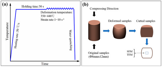 In this experiment, the main chemical composition of the CuSn10P1 alloy was 10.22 wt% Sn, 0.71 wt% P, 0.17 wt% impurity elements, and Cu in sufficient amounts. The semi-solid CuSn10P1 alloy blanks were prepared using an enclosed cooling slope channel (ECSC) device developed in the laboratory [12,20]. The alloy blanks used for the medium-temperature compression tests were cylindrical in size and Φ8 mm × 12 mm. The Gleeble 1500D testing machine was used for the compression test. Figure 1a shows a schematic diagram of the compression test process parameters. The specimen was heated to the set temperature at a heating rate of 50 °C/s and held for 30 s. When the temperature was uniform throughout the specimen, the specimen was subjected to hot compression tests at a set of different strain rates (0.1, 1, 5, 10 s−1) and deformation temperatures (350, 380, 410, 440 °C). The maximum true strain of the samples was measured at 0.3, and the experiments were immediately cooled with water to preserve the microstructure. In order to characterize the tissue evolution process, the experimental stress–strain curves at 350 °C and a strain rate of 10 s−1 were imported into Deform-3D software to simulate the compression process to obtain the strain distribution at different strains.