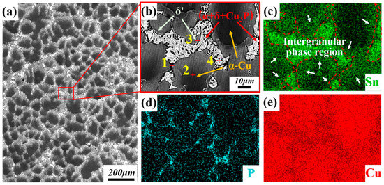 - The microstructure of the initial semi-solid CuSn10P1 alloy is nearly spherical, with a high-tin solid-solution circle around its primary α-Cu phase. The intergranular phase of the alloy is a brittle phase with high tin content composed of (α-Cu+δ-Cu41Sn11+Cu3P) phases. The microhardness and elastic modulus of the different phases in the alloy are intergranular phase > β’ > incipient α-Cu phase.