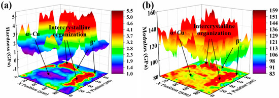 Characteristics of the initial semi-solid CuSn10P1 alloy: (a) 3D microhardness, (b) 3D modulus of elasticity.