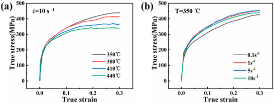 True stress–true strain curve for semi-solid CuSn10P1 alloy: (a) at strain rate of 10 s−1 and temperatures of 350−440 °C, (b) at temperature of 350 °C and strain rates of 0.1−10 s−1.