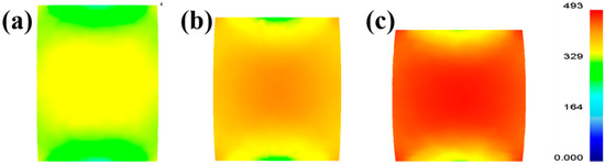 Stress distribution clouds for semi-solid CuSn10P1 alloy copper at different levels of compressive deformation: (a) ε = 0.1, (b) ε = 0.2, (c) ε = 0.3.