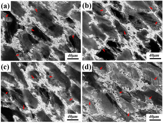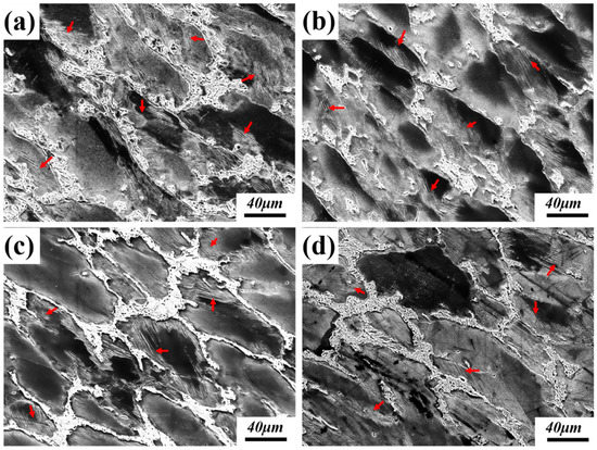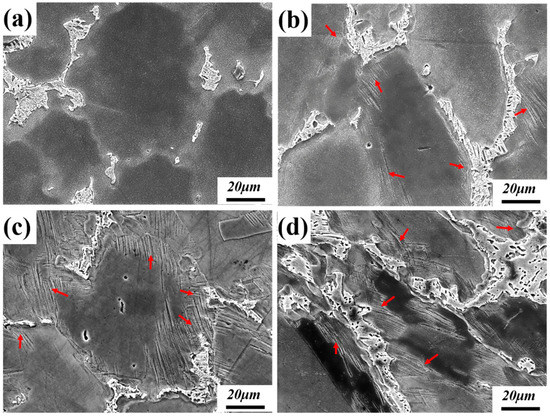 SEM images of the solid CuSn10P1 alloy at a strain rate of 10 s−1 and isothermal compression at different deformation temperatures, deformed to ε = 0.3: (a) 350 °C, (b) 380 °C (c) 410 °C, (d) 440 °C. (Arrows indicate deformation marks).