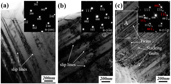 Figure 7 shows the bright-field transmission electron microscopy images of the semi-solid CuSn10P1 alloy at a strain rate of 10 s−1 and a temperature of 350 °C with different true strains. It can be visually observed that the deformation markings of the bars shift from sparse to dense. As shown in Figure 6a,b, it can be concluded from the diffraction pattern of the inset that the deformation marks observed at this point are slip lines composed of dislocations and layer dislocations. In Figure 7b, the diffraction pattern comparison shows that the slip line is parallel to the (111) plane. Note that, as shown in Figure 7c, the diffraction pattern in the inset shows that the bar deformation marker at this point is mainly composed of twins and layer errors. The twin crystals are {111}<112> typical crystallographic relationship structures. Both slip lines and twins are parallel to the (111) crystal plane, and twins may be preferentially nucleated on the (111) crystal plane where the slip lines are pre-existing. Regarding the plastic deformation mode, the slip mode becomes the main plastic deformation mode of the alloy at the true strain less than 0.2; when the true strain is 0.3, the twin mode becomes the main plastic deformation mode of the alloy. Eventually, the original coarse grains are cut and refined by twinning into lamellar organization.