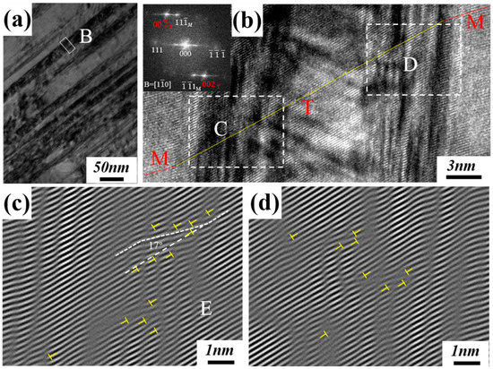 Figure 8a shows a magnified image of the white boxed area A in Figure 7c, where mutually parallel twin structures are observed. Figure 8b shows a high-resolution transmission electron microscopy (HRTEM) image of the white boxed area in region B of Figure 8a, with the Filtered Fourier transformation (FFT) mode inset. The typical matrix (M)–twin (T)–substrate (M) structure is observed here. Figure 8c,d show the inverse filtered Fourier transformation (IFFT) images of the boxed areas C, D in Figure 8b, respectively. Dislocations or layer dislocations are found to meet the twin grain boundary and are present to high density dislocations in the vicinity of the twin grain boundary. The high density of dislocations has approximately the same number of opposite signs. The fact that the dislocations are located near the twin boundaries indicates that the motion of the dislocations is prevented by the twin boundaries. As shown in the E region in Figure 8c, several dislocation pairs with opposite Burgers vectors aggregate to form dislocation multipole walls in a very small region. The dislocation multipole wall creates a misorientation angle of about 17° at the nanometer size and on the surrounding lattice. In fact, this type of dislocation wall is often observed within micro-twins and matrix lamellae.