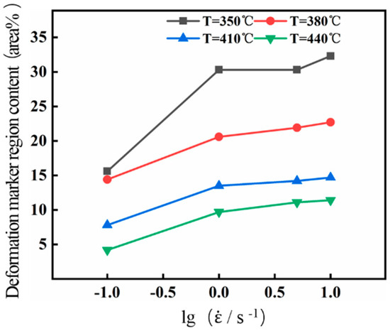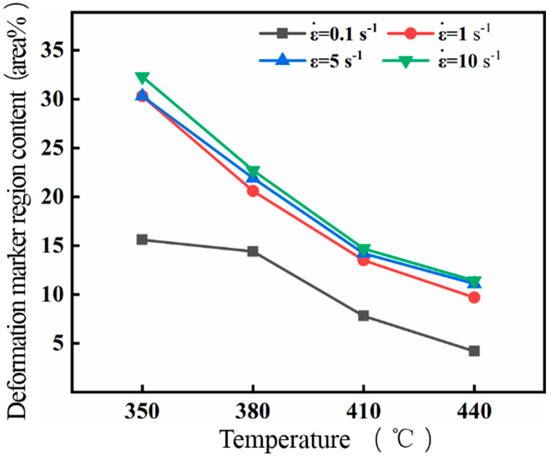 Figure 9 shows the microstructure of the semi-solid CuSn10P1 alloy at different deformation temperatures at a strain rate of 10 s−1 and a true strain of 0.3. Figure 10 shows the percentage of the deformation marks area in the semi-solid CuSn10P1 alloy at different deformation temperatures of 350−440 °C and strain rates of 0.1−10 s−1 using image pro plus 6.0. From Figure 9 and Figure 10, it can be seen that the effect of deformation temperature on the microstructure is mainly manifested in the difference in the percentage of striped deformation marker region area. Under the condition of a constant strain rate, the deformation marker region area decreases with the increase in deformation temperature. This is mainly due to the fact that increasing temperature increases the slip coefficient that can be opened, while the dynamic response consumes more value-added dislocations, which is not conducive to the production of twins, and the number of deformation marks decreases significantly with the increase in temperature [27,28].