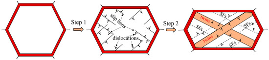 Figure 13 shows a schematic diagram of the evolution of the deformation marks during compression testing of the semi-solid CuSn10P1 alloy. Deformation marks are not present in the original alloy without compressive deformation. After step 1, when the compressive strain is small (ε < 0.2), many slip lines are first formed in the grains near the grain boundaries. At the same time, a large number of dislocations are formed near these slip lines. This may be attributed to the continuous interaction of dislocations on different slip planes to produce lattice defects, and the interaction of lattice defects and dislocations to form slip lines at the grain boundaries by plugging. The mechanism of lattice defect formation was confirmed in molecular dynamics simulations of TiAl alloys, where the process of dislocation sliding on different planes led to the generation of a large number of crystal defects [31]. After step 2, compression should then be further increased. It is noteworthy that a large number of SFs with deformation twins are generated in the deformed grains. These layer errors and twins flatten each other. Similar to slip, twinning occurs only when the tangential stress in the twinning direction reaches the critical parting stress [32]. This may be attributed to the fact that the dislocation slip motion is impeded by the grain boundary when it reaches the grain boundary, and the dislocation pile-up forms a dislocation pile-up group at the grain boundary, resulting in a high stress concentration. The highly concentrated local stresses reach the critical stresses required for twinning and excite twinning in the grains. It is a widely accepted theory that the prerequisite for twinning is the preexistence of a certain density of dislocation groupings, where the full dislocations break up into multiple layers of dislocations on adjacent atomic planes, and these layers form twinned nuclei [33].