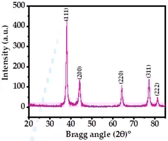 Figure 1 shows the X-ray diffraction pattern (XRD) of the processed powder via solution process. The XRD was utilized to determine the crystallinity, crystallite size, and phases of the prepared powder material. The spectrum illustrates the indexed and assigned peaks with their related positions, such as ˂111˃ (38.03), ˂200˃ (44.17), ˂220˃ (64.29), ˂311˃ (77.19), and ˂222˃ (81.30), and their close relation to the face-centered cubic (FCC) structure of metallic silver with the lattice constant a = 0.4086 nm, analogous to the accessible standards data of Joint Committee on Powder Diffraction Standards (JCPDS card no. 04-0783) (Figure 1) and earlier published literature [39,44]. The extreme peak positions indicate that the black-colored powder formed exhibits high crystallinity and a small particle size. The crystallite size was calculated by using the Scherrer formula with Origin software, as described previously, which was found to be ~13 nm (Table 1) [39,44]. The XRD spectrum displayed only Ag peaks, without any other chemical impurities, further indicating the purity of the sample.