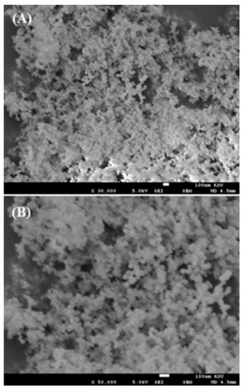 SEM images of AgNPs collected at (A) low magnification and (B) high magnification.