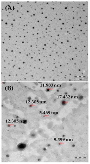(A) TEM images of AgNPs; (B) measurements of individual particle sizes.