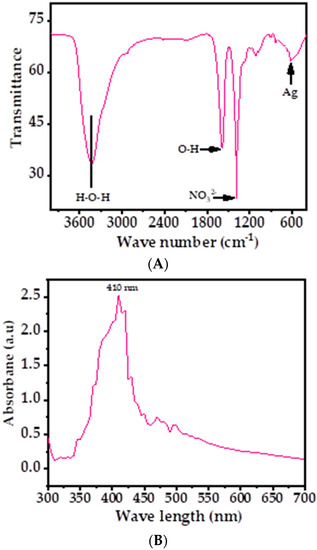 (A) FTIR spectrum of AgNPs depicts the corresponding functional groups; (B) the UV–visible spectrum of AgNPs.
