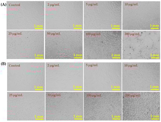 The liver (HepG2) and breast (MCF-7) cancer cells were cultured and their morphology detail was observed via light microscopy after incubation for 24 h in the presence of varying concentrations (2, 5, 10, 25, 50, 100, and 200 µg/mL) of AgNPs (Figure 5). Representative images of both cell lines show no remarkable changes in the morphology at AgNP concentrations of 2–10 µg/mL. However, AgNPs at 25, 50, 100, and 200 µg/mL affected the growth of cells and the rate was concentration and dose dependent. The morphology of cells at 50, 100, and 200 µg/mL was greatly affected (Figure 5).