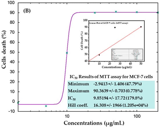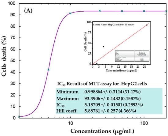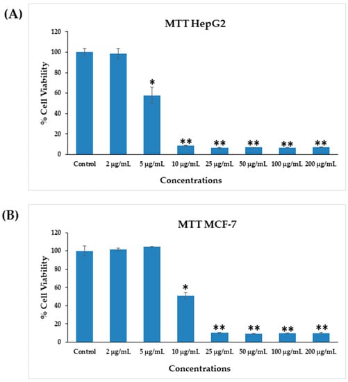 The viability of liver (HepG2) and breast (MCF-7) cancer cells treated with AgNPs and without treatment (control) was assessed using the MTT assay as per the following protocol [56,59]. For this experiment, initially, the cells were seeded in specialized 96-well plates (rate of 1 × 104/well) for 24 h at 37 °C in a humidified environment. Afterwards, the cells were treated with AgNPs at 2, 5, 10, 25, 50, 100, and 200 µg/mL and kept in an incubator for 24 h. After the cancer cells were well mixed in the plates, a prepared stock solution of MTT (5 mg/mL in PBS) was added at 10 μL/well in 100 μL of cell suspension and the plates were incubated for 4 h. When the incubation period was complete, the solution was removed from the wells and 200 µL of DMSO was added and mixed gently to dissolve the formazan product. The optical characteristics of the solution were examined at 550 nm using microplate reader (Multiskan Ex, Thermo Scientific, Vantaa, Finland). Control cells were also employed as a reference and run under the same conditions. Cell viability was calculated as per the equation mentioned below: